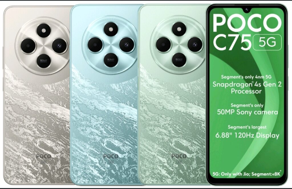 - POCO C75 की कीमत की बात करें तो यह फोन flipkart में 7,499 और Amazon में 7,799 की कीमत के साथ मै मिलती है, और आपके पास credit card है तो कीमत मै कुछ छूट मिल सकती है।